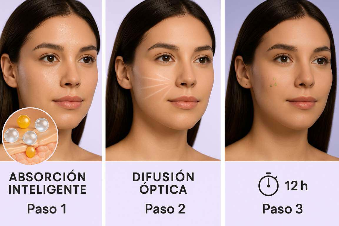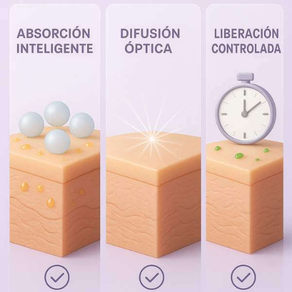 Estas esferas dispersan la luz → “soft-focus”: difuminan poros y líneas finas en segundos.